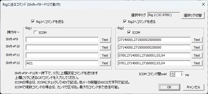 2台のリグコントロールができますので、Rig1とRig2の2つの設定があります。使うリグに応じてダイアログの上にある「Rig1へコマンドを送る」もしくは「Rig2へコマンドを送る」チェックボックスにチェックを入れてください。